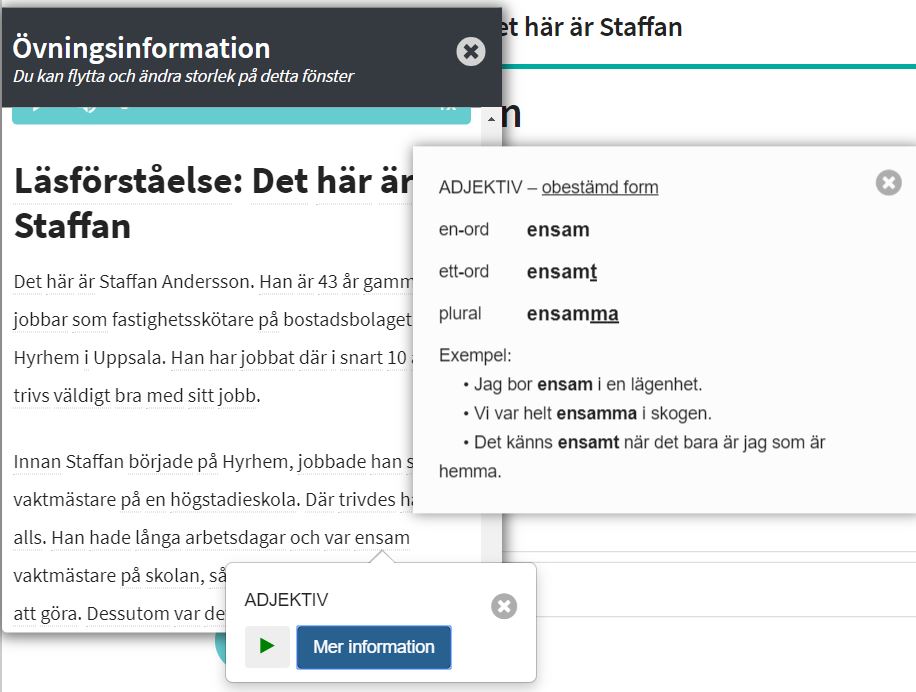 Klicka på ordet ensam, nu kommer det upp en ruta som det står mer information på, du kan klicka på den gröna pilen och lyssna på uttal av ordet. Klicka sedan på rutan.